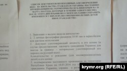 Усередині приміщення вивішений перелік документів, необхідних для отримання посвідки на проживання. Він стосується тих, хто до 18 квітня 2014 року, маючи кримську прописку, виявив бажання зберегти громадянство України. Для цього необхідно написати заяву на ім'я начальника УФМС Росії в Криму, надати дві особисті фотографії, документ, що засвідчує особу та його копію (у разі надання українського закордонного паспорта – нотаріально засвідчений його переклад російською мовою), свідоцтво про народження та його копію, а також підтвердження постійного проживання на території Криму на 18 березня 2014 року (штамп у паспорті громадянина України).