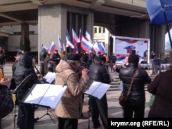 Перед присутніми під будівлею Держради виступили представники нинішньої влади – глава Криму Сергій Аксьонов, спікер Володимир Константинов і повноважний представник президента Російської Федерації в Криму Олег Белавенцев.