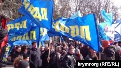 Перше урочисте зібрання з нагоди річниці заплановане біля Державної Ради Криму. Територія перед парламентом оточена співробітниками поліції і представниками самооборони. Охочі потрапити всередину мали пройти через металеву рамку.
