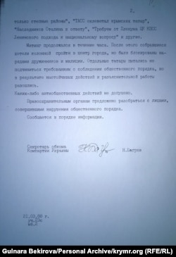 У Центральному державному архіві громадських об'єднань України збереглася інформація «Про обстановку серед кримських татар» завідувача відділом адміністративних органів ЦК Компартії України Чумака Щербицькому від 1 квітня 1988 року