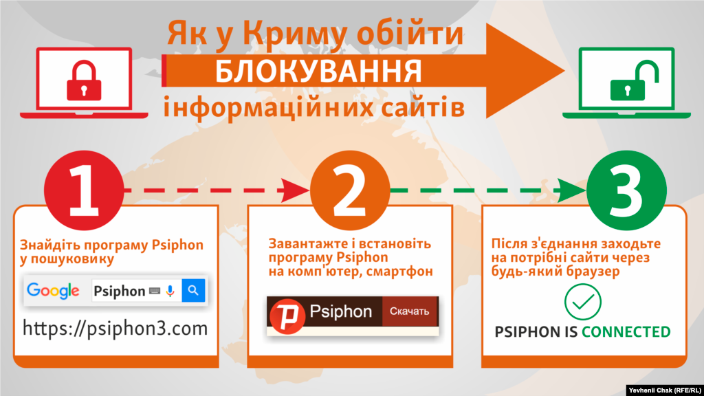 Не можете отримати доступ до сайту Крим.Реалії? Підозрюєте, що сайт заблокували? Інструкція – як обійти блокування: скачайте і встановіть програму Psiphon через пошуковик. Коли з'єднання встановиться, заходьте на потрібні сайти через звичайний браузер.