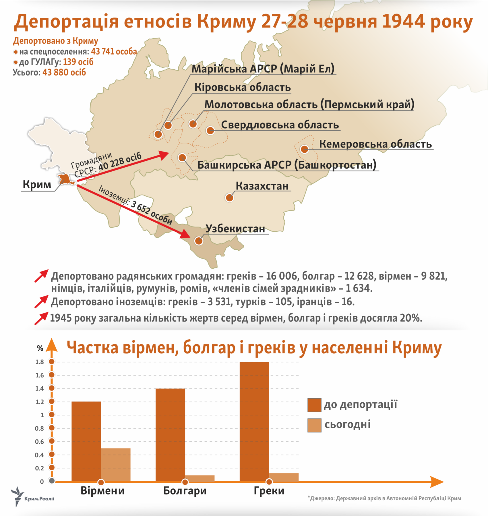 Депортація кримськотатарського народу в 1944 році стала найбільш масштабним, але не єдиним злочином радянського режиму. Окрім кримських татар, насильницького вигнання з півострова в 1941-1944 рр. зазнали представники й інших етносів у Криму
