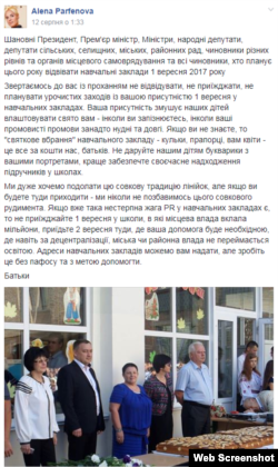 Відвідування чиновниками шкіл 1 вересня підживлює радянську традицію «лінійок». Подекуди, очікуючи на приїзд політика, дітям доводиться годинами стояти під палючим сонцем, а потім вислуховувати їхні бюрократичні промови. Тож співголова громадської організації «Батьки SOS» Олена Парфьонова закликала посадовців не приїжджати до шкіл на День знань.