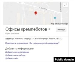 «Фабрика тролів», яка колись працювала в Ольгино, а потім на вулиці Савушкіна, тепер існує за новою адресою в Санкт-Петербурзі: вулиця Оптиків, 4, корпус 3. Кумедно, що гугл-карти видають під час пошуку цієї адреси «офіси кремлеботів».