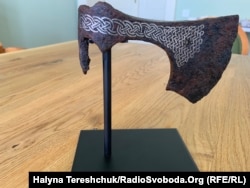 «Форма сокири збереглась. Скандинави на цей момент були язичниками, вовк їх тотемний символ. Взір добре проглядався, «чорні копачі», на щастя, не втручались у метал і не рухали візерунок, який зроблений зі срібла. Сокира інкрустована скандинавськими взорами, є чіткий символ Володимира Великого – тризуб, який він обрав і використовував як свій герб і як державний», – зауважив Тарас Хмеловський.