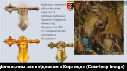 «Чому емблема має такий вигляд пернача у руці? Це фрагмент з картини «Битва під Оршем». Відома битва 1514 року, коли повністю вщент було розбите московське військо, скажімо так, литовсько-українськими військами під командуванням князя Костянтина Острозького. На фрагменті картини можна побачити, що він тримає в руці саме пернач подібним чином. Автори сказали, що це їх надихнуло», – розповідає історик, пояснюючи появу пернача у символіці, якою користуються танкові війська України.