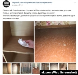 «Табір імені Гагаріна, Євпаторія! Тут сумку страшно на підлогу покласти, не кажучи вже про дитину, якій 1,9 року! Харчування розраховане на дітей від 7 до 16 років! Напрошується питання: що тут робити дітям нашого віку?! Ми поїхали від хімії, а приїхали в номери з тарганами, пилом, брудом, сміттям, запльованими стінами, не кажучи вже про постільну білизну, стан меблів і кімнат у цілому! Невже ми заслуговуємо такого ставлення до себе!» ‒ пишуть жителі Армянська в соцмережі «Вконтакте».