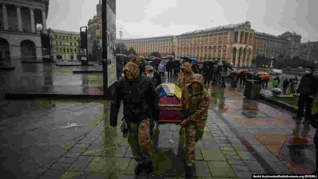 У Києві, на майдані Незалежності, попрощалися із військовим Миколою Микитенком, який підпалив себе на знак протесту. Попри погодні умови, попрощатися із ветераном бойових дій на Донбасі прийшло кілька десятків людей.