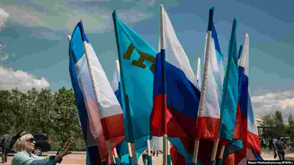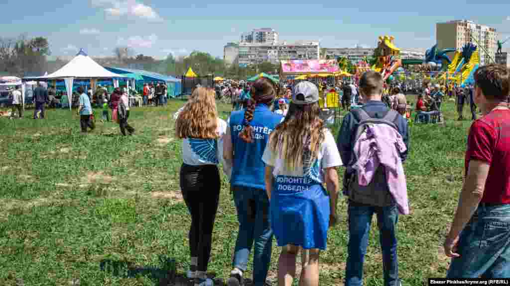 Як повідомляє кореспондент Крим.Реалії, територію святкування позначили огороджувальною стрічкою, по периметру якої чергували співробітники Росгвардії і поліції. Вхід на територію вже традиційно для організованих владою свят проводився через рамки металошукачів.
