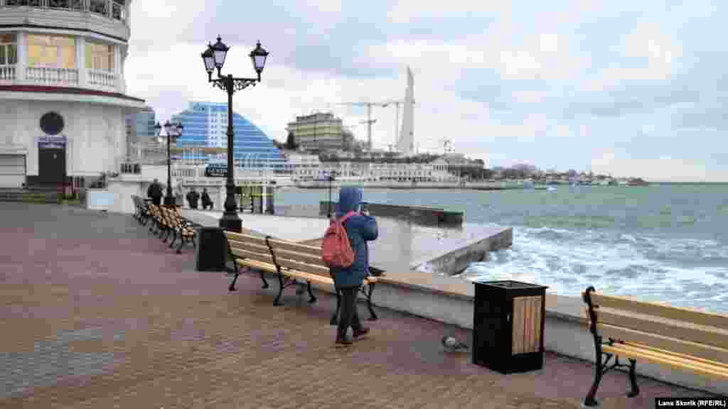 Дівчина знімає на смартфон, як хвилі б'ються об набережну біля входу в Артилерійську бухту
