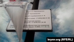 На інформаційному табло пляжу поруч із точкою продажу шаурми зазначені номери телефонів «екстрених служб» і «гарячих ліній» Мінкурортів Криму, а також влади району. Щоправда, розміщені вони на висоті не менше трьох метрів від землі й половину тексту на них закривають прапорці з символікою міста.