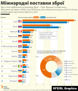 При цьому, стверджує дослідження, другим за обсягом покупцем українського озброєння за цей період стала Росія, яка з 2014-го протягом усього звітного періоду за 2016–2020 роки й досі веде проти України війну. За повідомленням інституту, Росія скупила за цей час 20 відсотків від усього обсягу експорту українських озброєнь. Першим із 36 відсотками став Китай, третім із 17 відсотками – Таїланд.