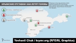 Точкові зміни у кримській владі почалися на початку цього року. Але восени процес активізувався, на півострові почалися масові відставки. Свої пости стрімко залишають голови адміністрацій регіонів та кримські міністри.