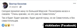 «Сьогодні провіз дружину Великою Морською. Подивилася на все і сказала: «Дуже красиво, але це вже не Севастополь». Так і буде. Буде гарно, буде інше місто, але не Севастополь і без севастопольців», ‒ написав у своєму Facebook громадський активіст.