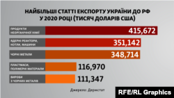 Згідно із даними Держстату, вироби зі скла складають лише пів відсотка від загального обсягу експорту в Росію. У період із січня по вересень 2019 року Україна також експортувала іграшок на 10 мільйонів доларів США. Приблизно стільки ж – ефірних олій. Кожна з цих категорій товарів складає не більше, ніж 0,5% експорту України до РФ за перші три квартали 2020 року.​